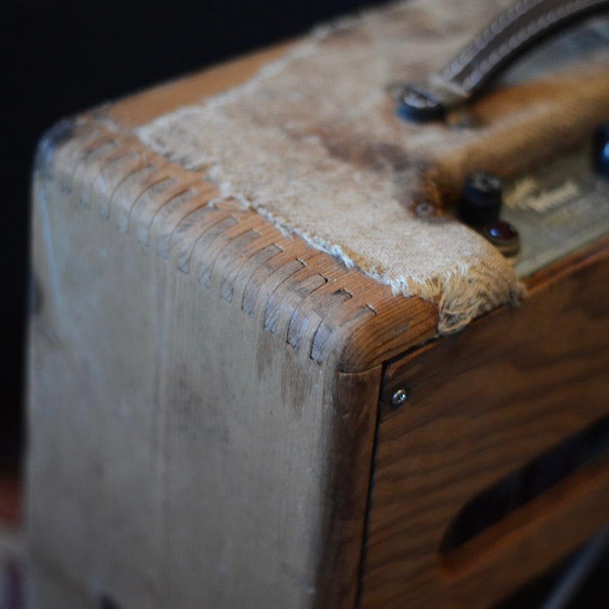 When it came to me there were a few small cracks where the chassis screws to the cabinet but these repaired nicely. They are barely noticeable unless you look very closely, and the cabinet is as sturdy as ever. It is missing the tweed on the sides of the amp, but all of the remaining tweed is original and I think it looks amazing.