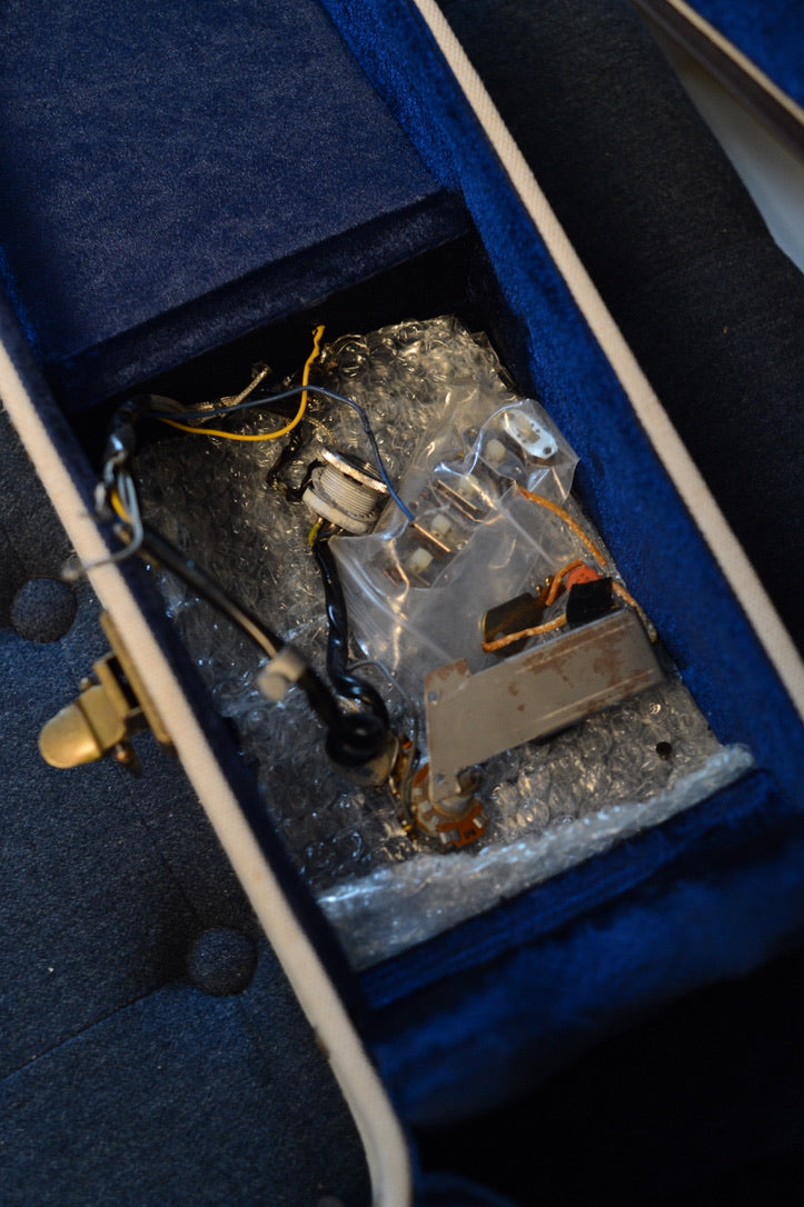 Check out this tastefully modified Epiphone Professional! All the changes that have been made were well done and it plays and sounds great. A second pickup was added, which is a patent number Gibson from the 60’s. The built-in controls were removed but remain in the case. Everything needed to put the electronics back to original is there, just not the knobs that would go on them. Cosmetically it is in excellent condition and it looks as if it was almost never played. There are some minimal scratches and dings but no repairs. The frequentsator, ABR-1, and tuners are all high quality replacements. It has the wide neck and a fantastic ‘64 Gibson style profile.