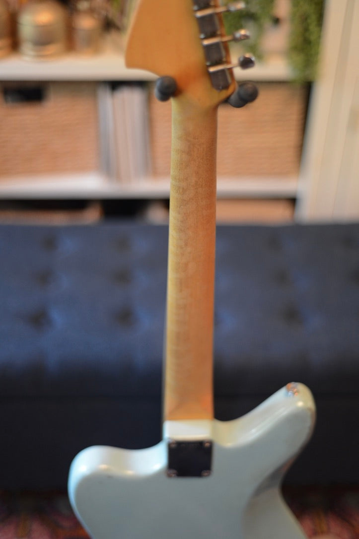 Check out this super cool 1963 Jaguar! It has an old sonic blue refin, the color is hard to capture in photos but the headstock and the body are the same color, and are very accurate to sonic blue. The neck does have some back bow, and could use a heat set in the future, but it is set up pretty well as is. It has the desirable flat pole piece pickups which sound amazing. The action is comfortable, and there is some minor fret buzz on the lower frets, but it is nothing that can be heard when plugged into an amp. The back of the neck has no finish on it and is really smooth to play.