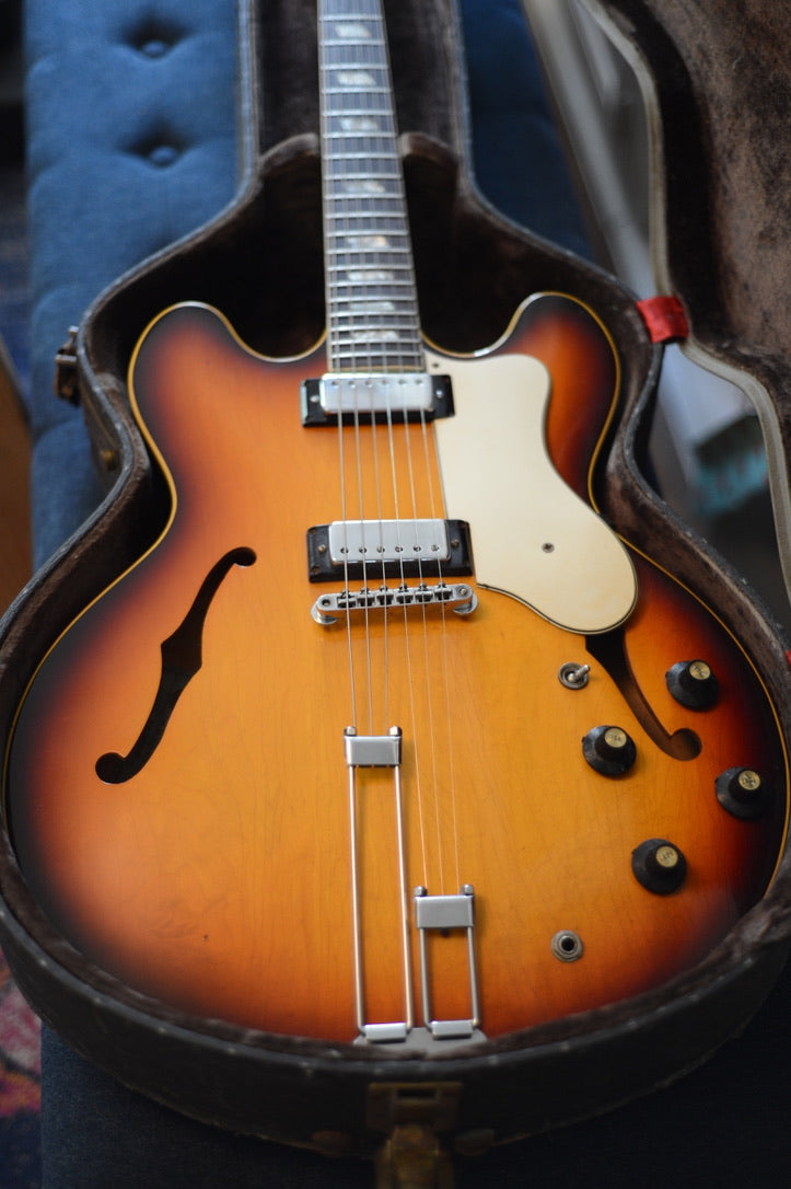 Check out this awesome player's grade 1967 Epiphone Riviera! These vintage Epiphones are still super underrated considering they were made right next to their Gibson counterparts in the Kalamazoo factory. This guitar plays really well and sounds fantastic with the original mini humbuckers and electronics. The original sunburst finish looks spectacular. It would make a great addition to any collection. At one point it had a headstock break which was repaired and it is very solid. The tuners were replaced with newer Klusons. Since the pictures were taken I have added a black switch tip (it was previously missing one).