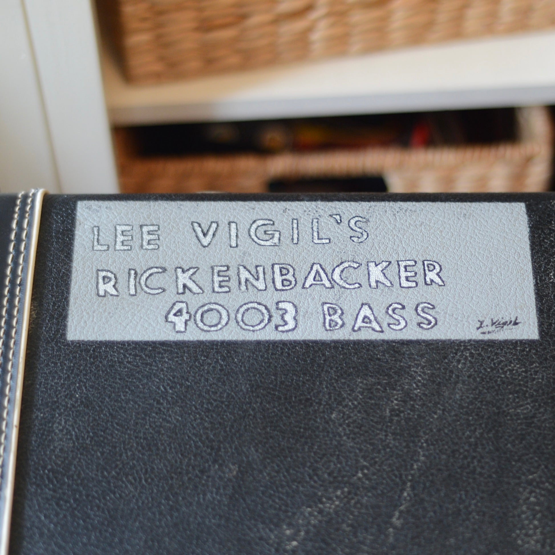 It comes in the original hardshell case which someone (presumably Lee Vigil) painted, “Lee Vigil’s Rickenbacker 4003 Bass”.